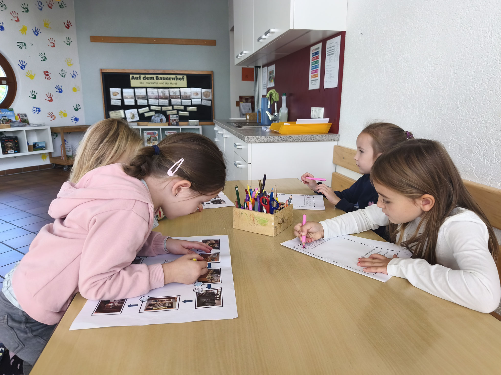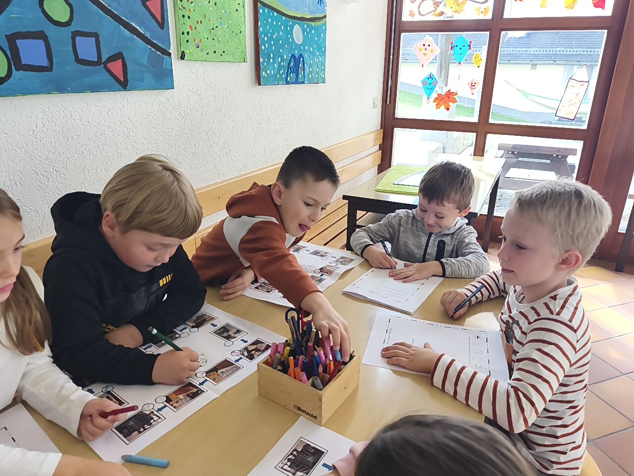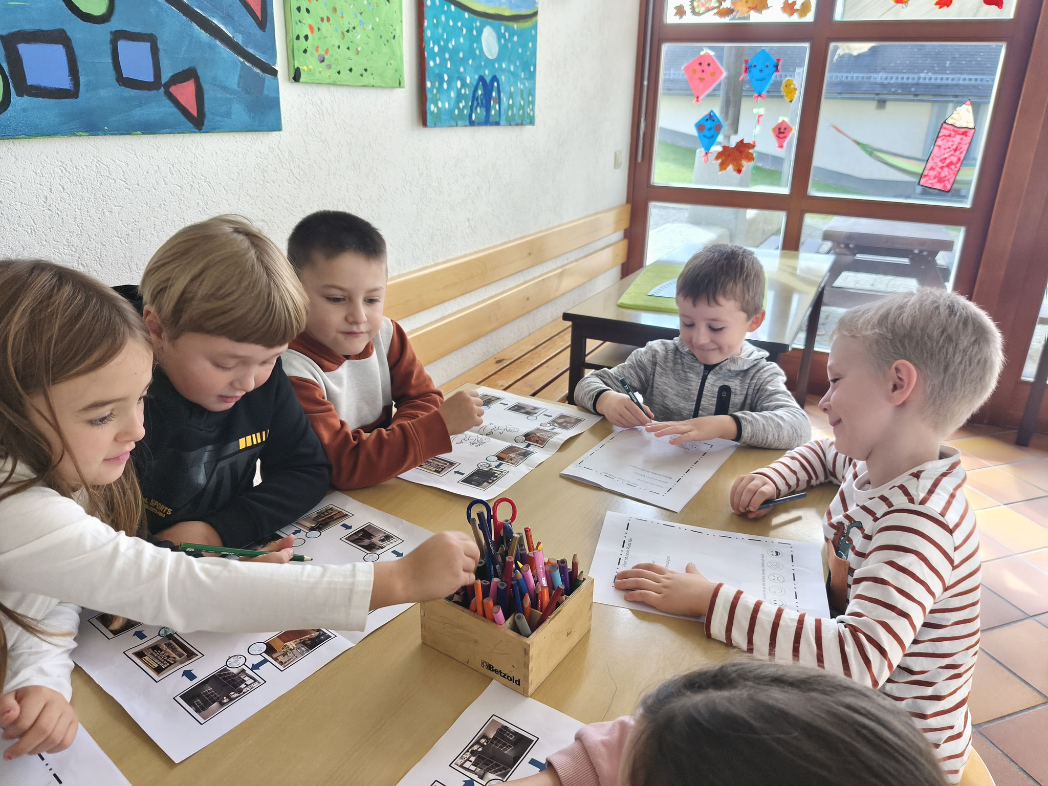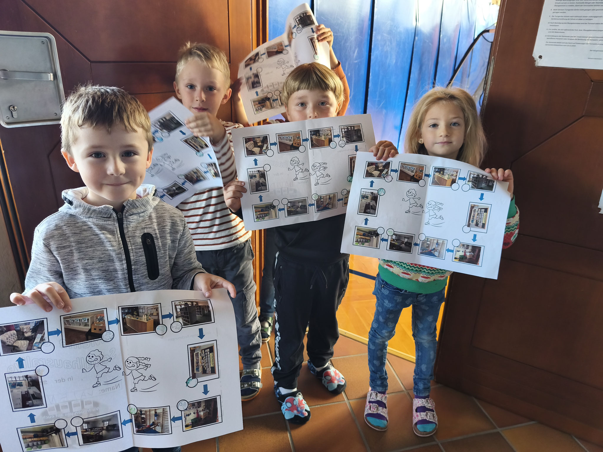 Im Zuge der ersten Nahtstellenbegegnung mit dem Kindergarten durften die acht Schulvorbereitungskinder die Schule bei der Schulhausrallye erkunden. Keine Ecke war bei der Bildersuche vor den neugierigen Kinderaugen sicher.