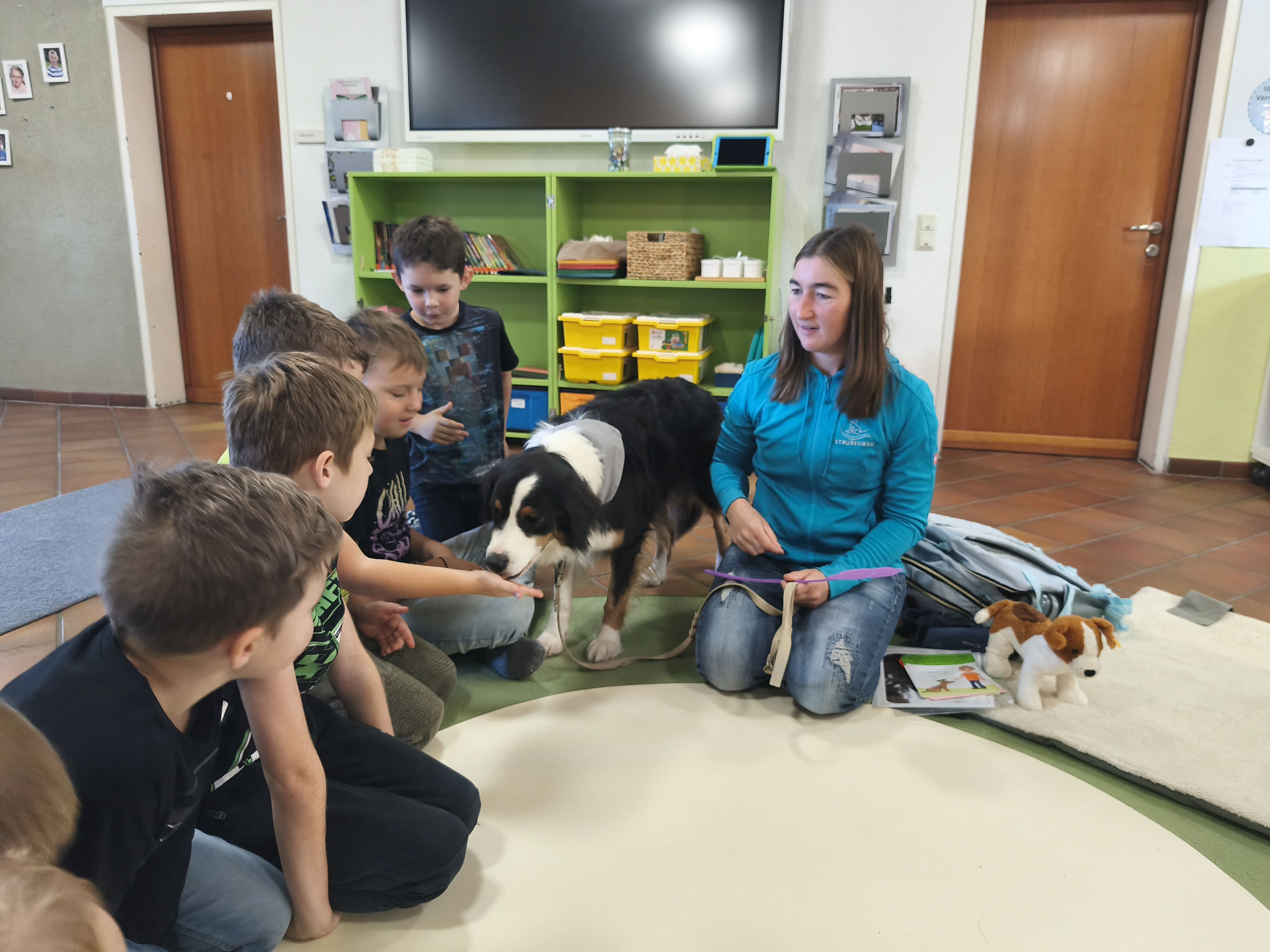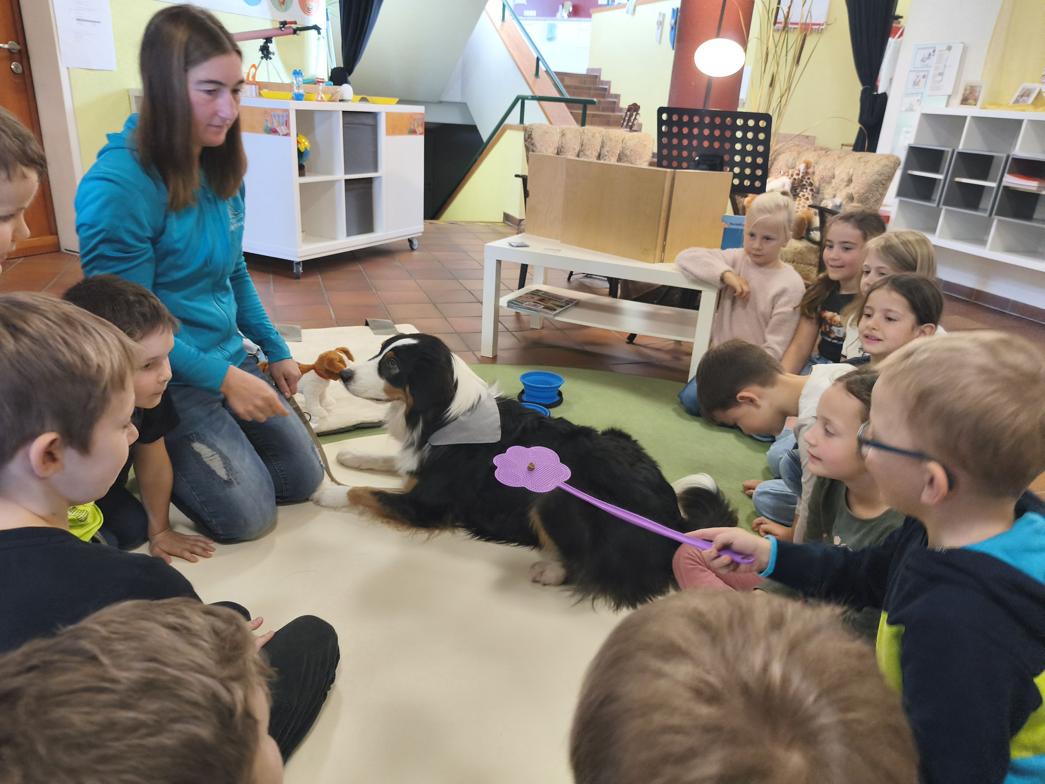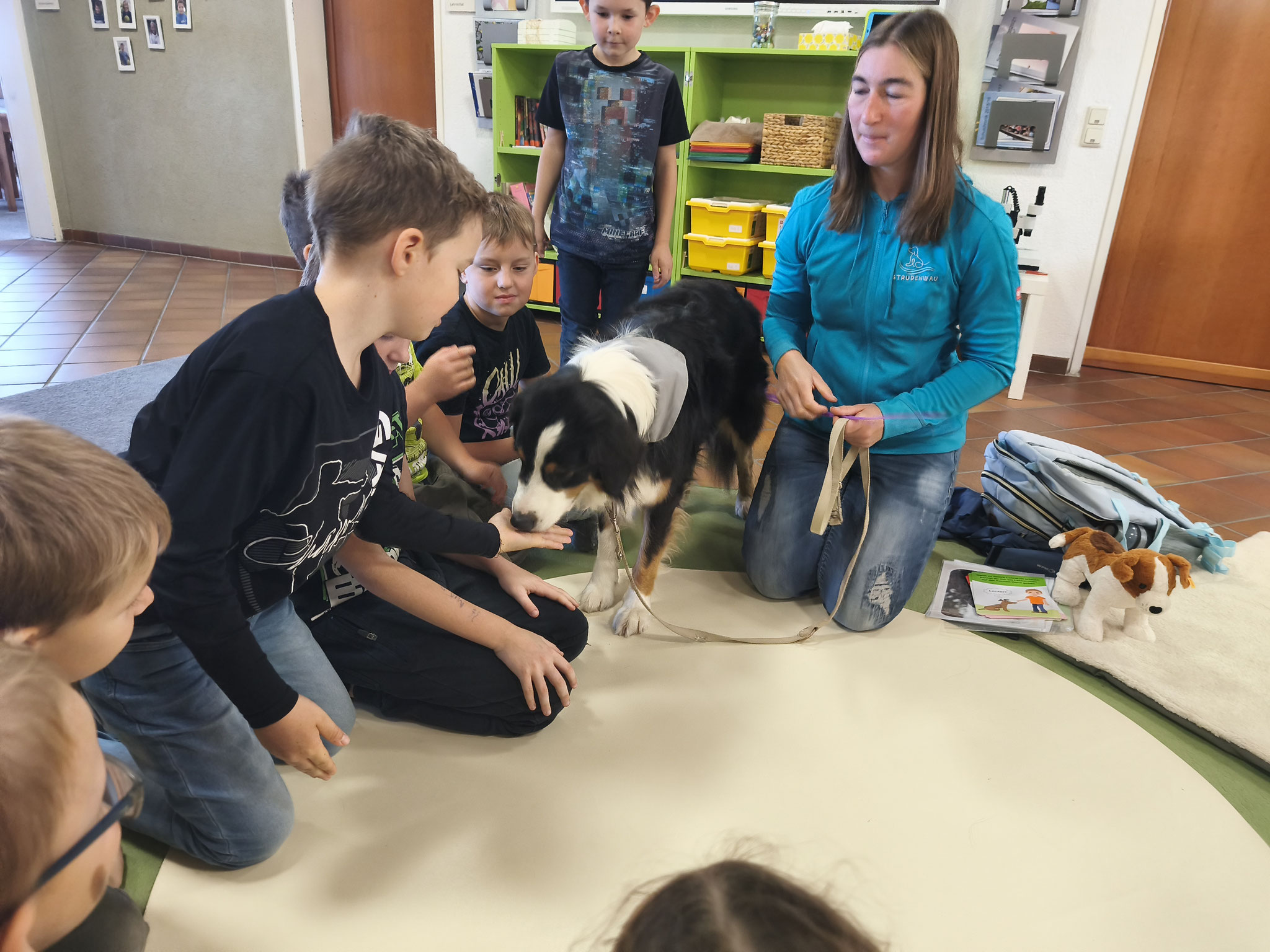 Die Kinder waren begeistert über den Besuch von Helena mit ihrem Schulhund Miko, die ihnen gemeinsam wichtige Grundlagen zum Umgang mit Hunden vermittelten. Auch für Miko-Streicheleinheiten blieb noch genug Zeit.