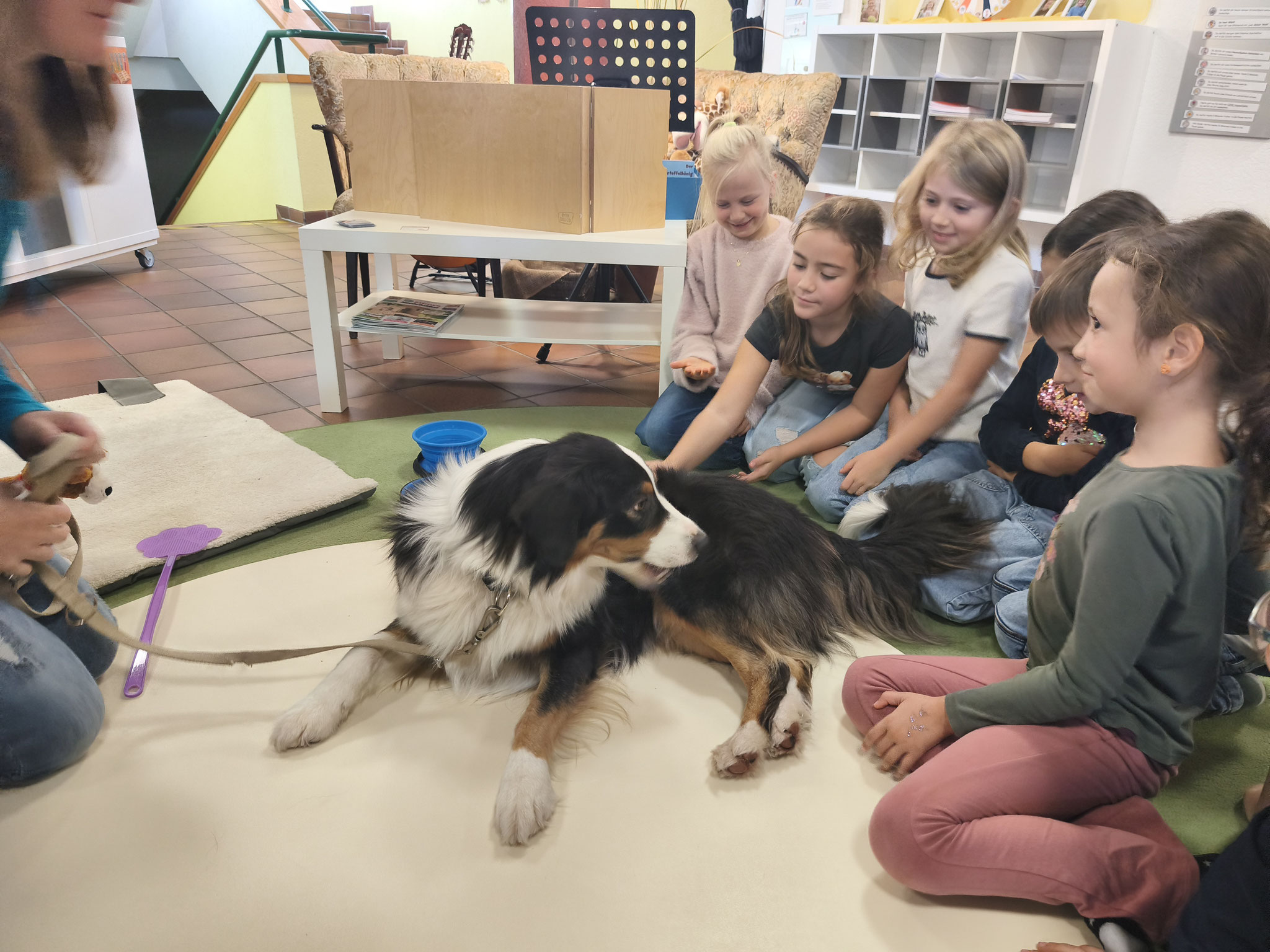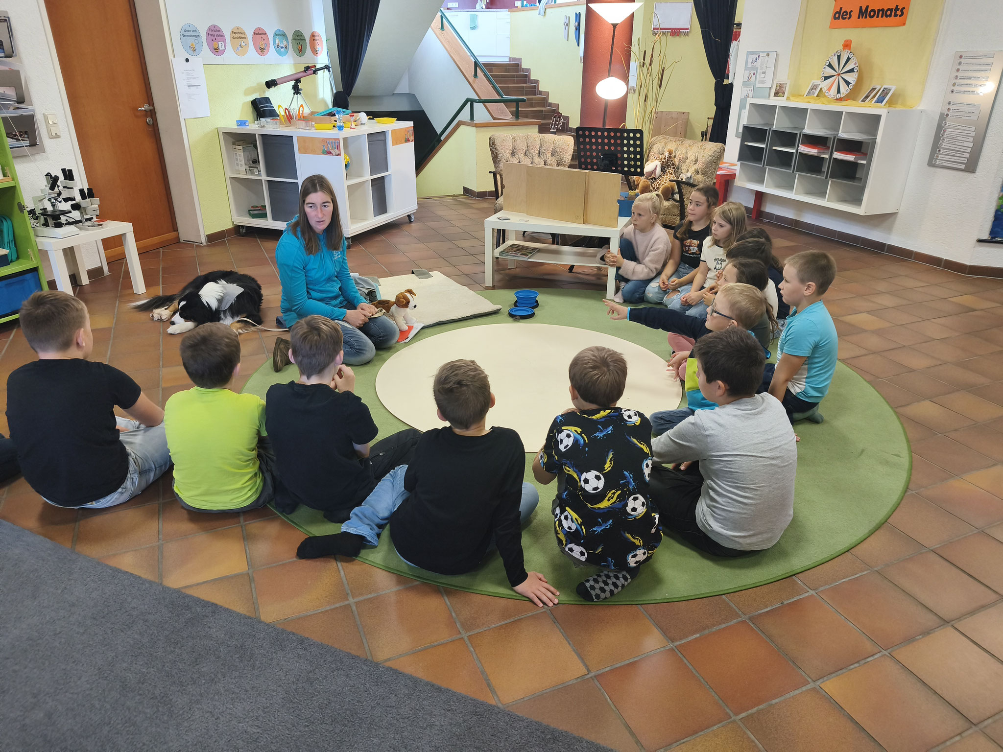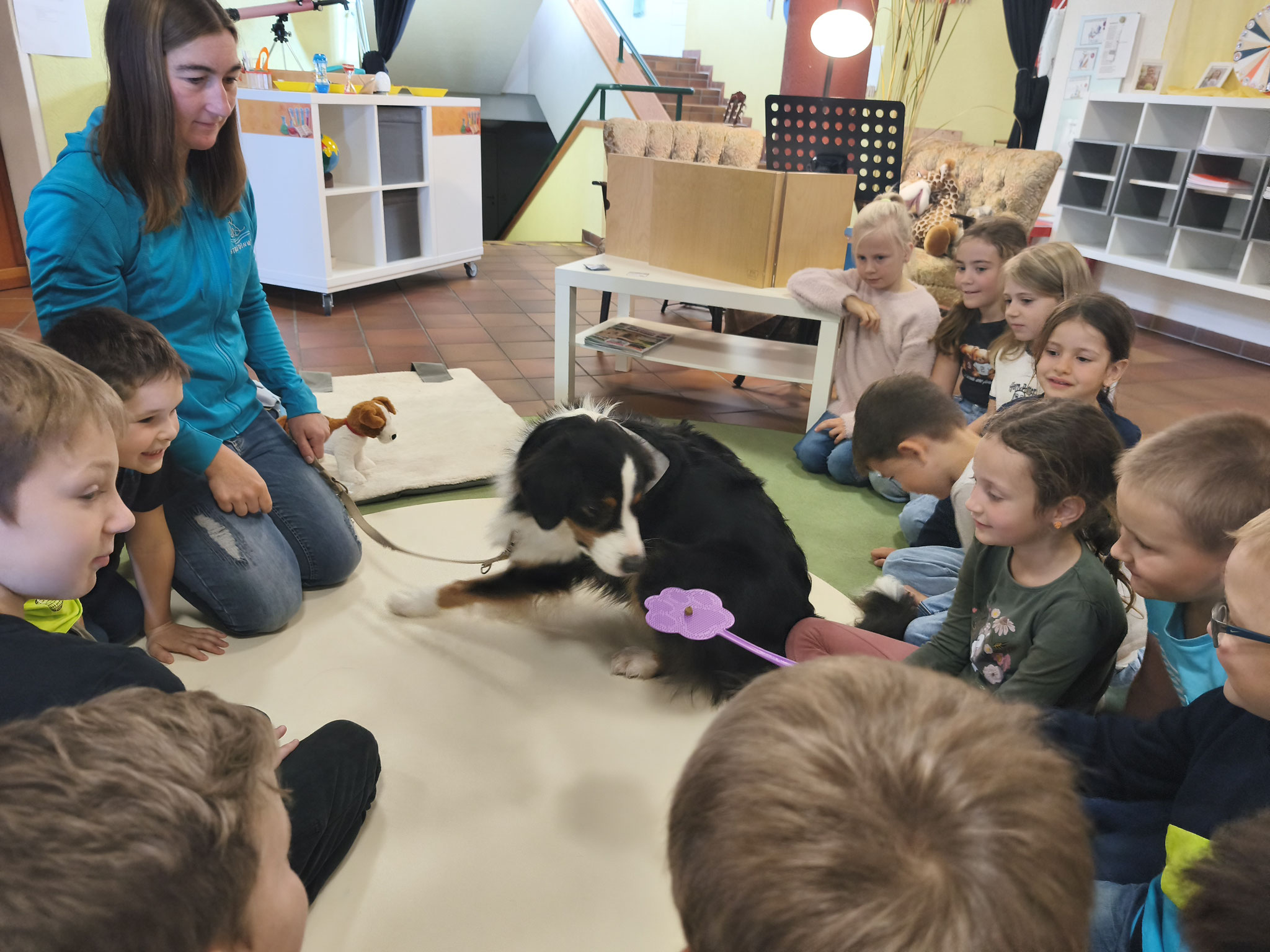 Die Kinder waren begeistert über den Besuch von Helena mit ihrem Schulhund Miko, die ihnen gemeinsam wichtige Grundlagen zum Umgang mit Hunden vermittelten. Auch für Miko-Streicheleinheiten blieb noch genug Zeit.